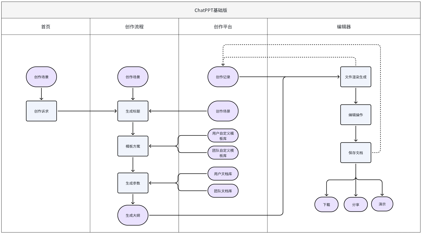 | 创作流程 | 通用场景生成PPT(基础模式) | 主题生成PPT | 触发基于指令生成PPT的通用PPT文档的生成流程 | |